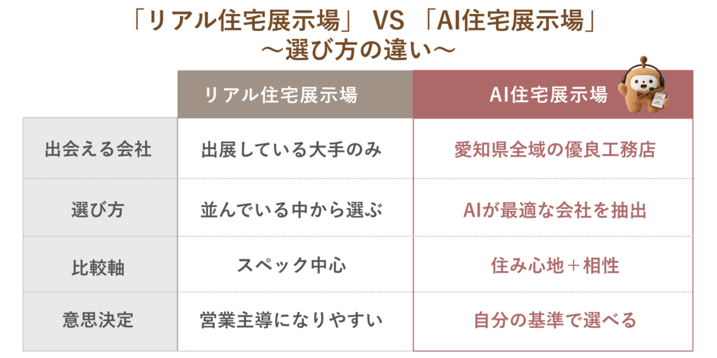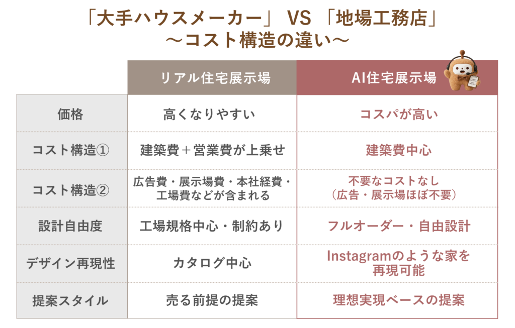 | 【 大手ハウスメーカー(リアル展示場) 】 | 【 Ai住宅展示場 】 | |
